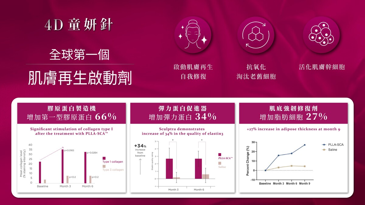 2023升級登場的4D童妍針,於2024巴黎舉辦的世界抗老醫學會上,由專業醫師進一步發表實證不只能激生膠原蛋白填補凹陷紋路,還能啟動肌膚再生途徑新生彈力蛋白、抗老化淘汰老舊細胞甚至能活化肌膚幹細胞,促進肌膚汰舊換新,術後更有毛孔縮小、膚質更細緻平滑的功效,一種材質多種功效,可說是保養抗衰的極致選擇,層層作用在老化的各個面向,重啟肌膚年輕活力,逐步喚醒巔峰顏值,自然漸進地回到最美時刻。