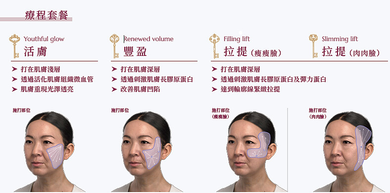 藉由不同層次施打、不同劑量規劃,4D童妍針可以完全客製化、針對個人不同的老化情況來做改善,去年推出的4D肌膚再生之鑰,施打在淺層的活膚療程,可以提升肌膚彈力、亮度與光澤,淡化細紋;豐盈療程則是經典療程,施打在深層填補凹陷和深紋、重塑深層脂肪墊、增加皮膚厚度逆轉肌齡; 拉提療程則透過施打在外輪廓,收緊筋膜層、緊緻輪廓線。就像是美顏隱形線雕,如同埋線原理,來產生隱形拉提的效果視覺上更顯小臉。