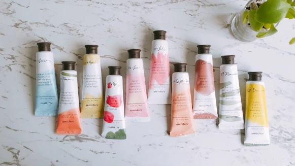 大量運用韓國濟州島的自然原料是innisfree保養品的招牌特色,12月一口氣推出10款護手霜,更是收錄了濟州島一年內不同月份的特色風景,其中像代表4月的「婚禮的花束」、6月的「水蜜桃」、7月「粉紅珊瑚」都是熱銷款。