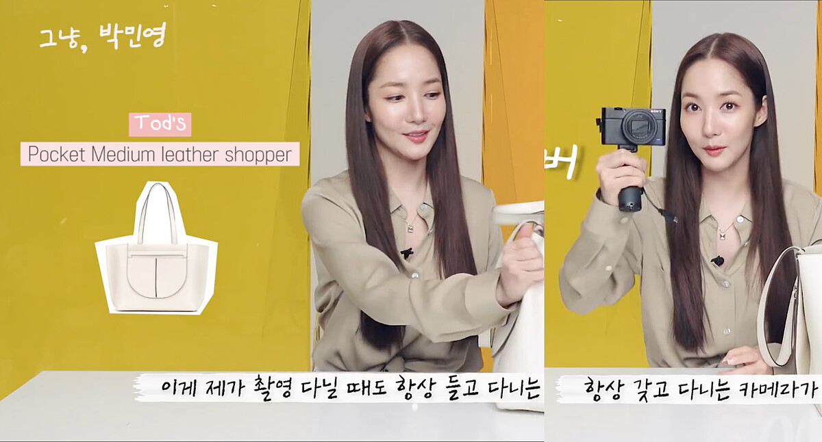 朴敏英表示自己真的會帶很多東西,所以包包一定要夠「大」才行,這次公開的包款是TOD’S的米白色托特包,她甚至說:「就算是這種大小,還是常常不夠!」而身為Youtuber最重要的東西之一就是相機,她使用的是SONY的隨身機ZV1。