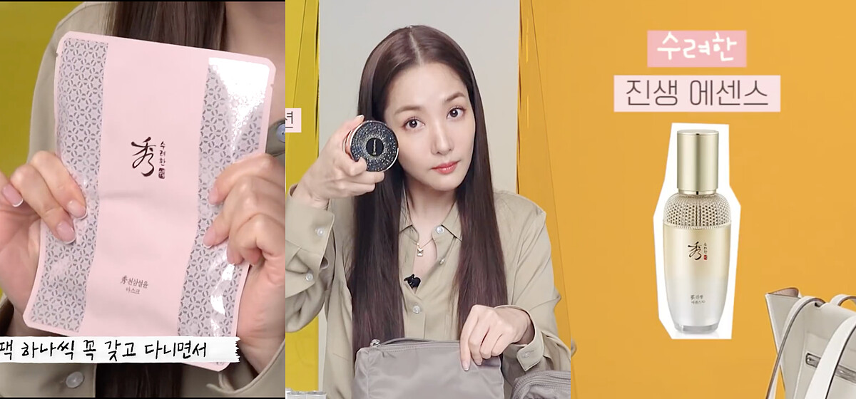 身為秀雅韓的品牌代言人的她,包包裡的面膜、氣墊和精華液都是秀雅韓,拍攝時上妝前會先使用它們保養,好好滋養肌膚。