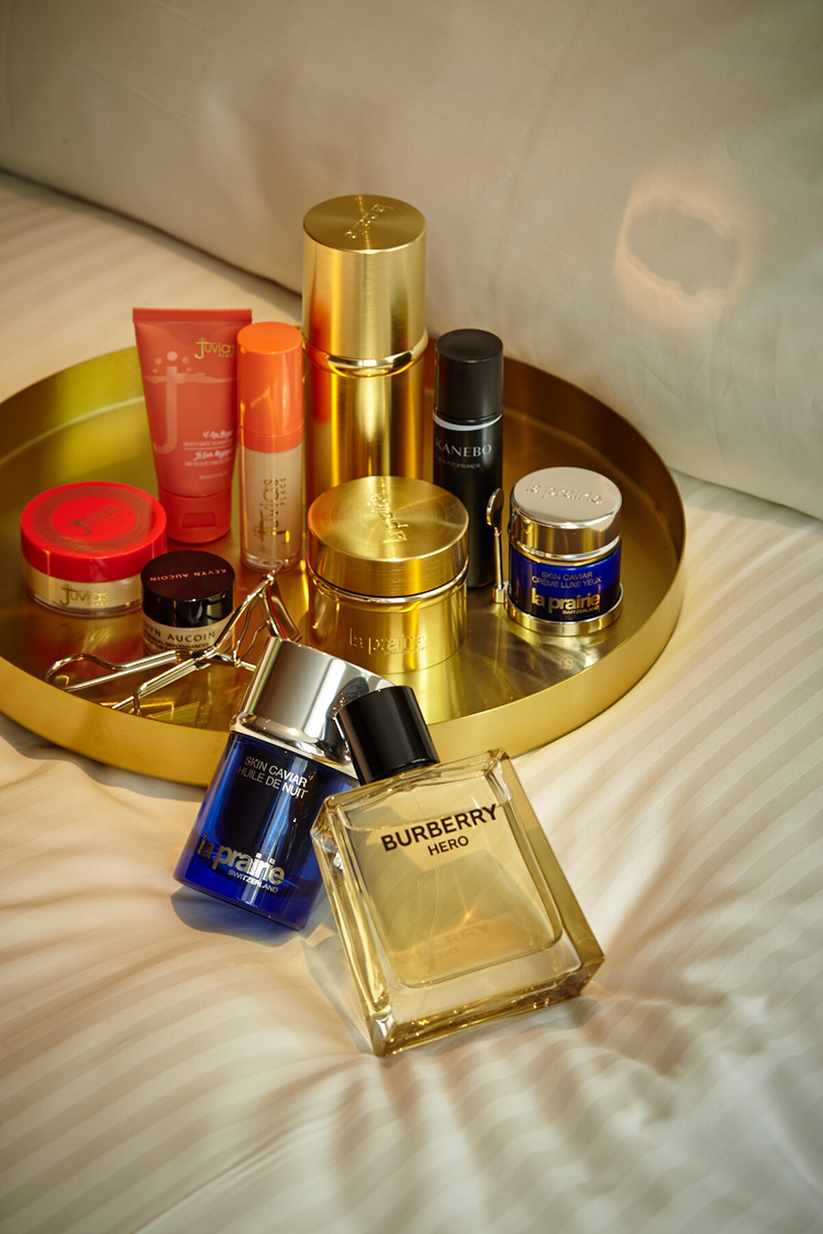 1. Juvia's Place 蜜粉。2. Kevyn Aucoin 遮瑕膏。3. Kevyn Aucoin 睫毛夾。4. Juvia's Place 粉底液。5. Juvia's Place 遮瑕膏。6. La Prairie 極緻金燦精華,NT28,950。7. La Prairie 極緻金燦眼霜,NT21,750。8. KANEBO 光濾鏡美肌露。9. La Prairie 魚子美眼霜,NT13,550。10.La Prairie 魚子美顏夜間緊緻精華油,NT18,100。12.Buberry Hero 英雄神話男性淡香水,NT3,800。