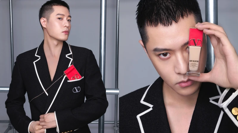 這次擔任品牌大使,對他來說Valentino Beauty不僅潮、酷,還充滿設計文化,讓他非常喜愛。 特別是拍攝接觸到的 「高訂隨行彩妝盒」,覺得男生揹在身上都帥。另外, 他笑說「拍攝時用的柔霧唇膏#107A比莉姐超愛,拍攝結束後已經從我包裡拿走!」