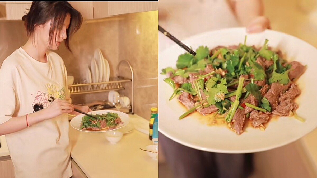 王楚然還曾親自示範她的減脂料理怎麼煮,以一道「香菜牛肉」展現好廚藝。