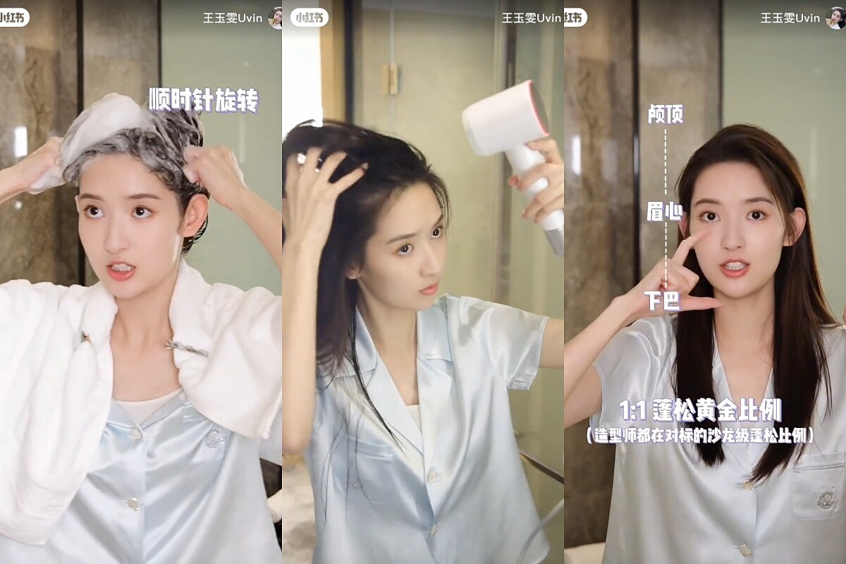 王玉雯的髮量看起來滿多的,小技巧就是選擇控油洗髮精,洗完頭髮會輕盈比較蓬鬆,洗頭髮時可以用拳頭按摩頭皮,幫助頭皮循環,吹頭髮時從髮根開始吹,就能吹出蓬鬆髮根,讓頭頂到眉心、眉心到下巴的比例變成1:1,就會有自然的瘦小臉效果啦!