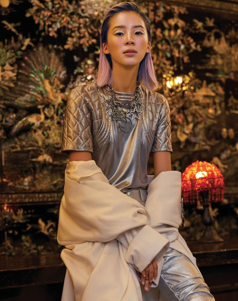Irene 換上一套全銀的服裝,擦著銀色眼影,以及一頭銀灰透出七彩的髮色,和老舊的韓藥房產生奇異的衝突感,她像一頭獨角獸,慢慢走入鏡頭,擺出第一個 Pose。