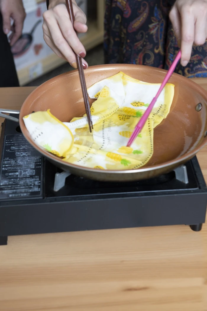 製作蜂蠟布事先需要準備蜂蠟、有機荷荷芭油、有機棉布以及平底鍋,作法也相當簡單,先把平底鍋小火加熱後,加進三滴荷荷芭油,然後將蜂蠟放進鍋中溶解,等到出現蜂蠟汁液後,將棉布放入鍋中,並將蜂蠟平均塗抹在布料上,完成後將蜂蠟布取出風乾3分鐘,輕輕鬆鬆便能完成一塊。黃老闆說:「自製蜂蠟布的使用期限大約是3個月,可以用水洗沒有問題,然後還能再次重新製作使用。」沛慈說:「這樣以後買早餐就不需要紙袋裝了,直接請老闆幫我把火腿蛋或是漢堡用這個包就可以啦!(笑)」