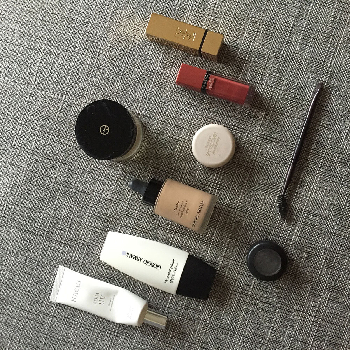 底妝的部分我會先上透明的防曬隔離,然後再擦粉底液。用過嬌蘭、GIORGIO ARMANI,我習慣會兩種交替使用。嬌蘭用完後就又換回GIORGIO ARMANI了,比較輕薄沒有負擔(味道也很舒服啊)。小罐的資生堂遮瑕膏用來遮黑眼圈滿好用的!或者是一些小紅腫或疤的地方(像前幾天被電棒燙到留了疤),遮遮遮什麼都可遮。口紅我有兩個固定使用,YSL唇膏已經用了一年啦!一支就可以用好久好久!我會以輕抹的方式在嘴唇上,讓自己看起來有氣色。另一個ROUGE EDITION VELVET超難買到的!但是真的不太掉色,顏色也很優秀。