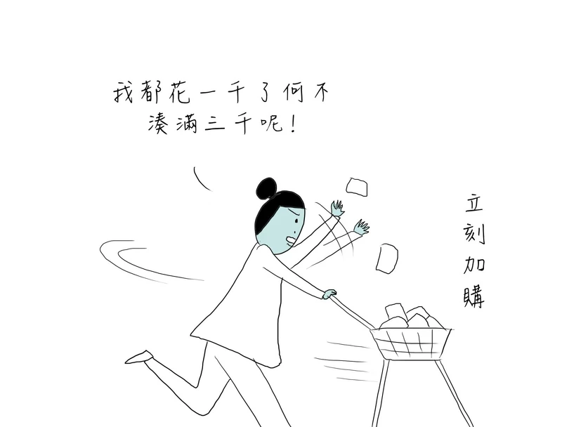 有一次我在藥妝店買洗面乳,結帳時店員說消費滿800就會送100元抵用卷喔!我一聽立刻覺得哇!送100耶!然後轉身開始逛起來,拿了護唇膏、軟糖等有的沒的,好不容易湊到800,回家發現抵用卷有效期限只剩幾星期,然後放著放著就過期了,不僅沒被優惠到還多花了錢買一堆雜物,所以下次遇到優惠活動時一定要先冷靜思考、雙手合十、閉眼冥想,不要再衝動了。