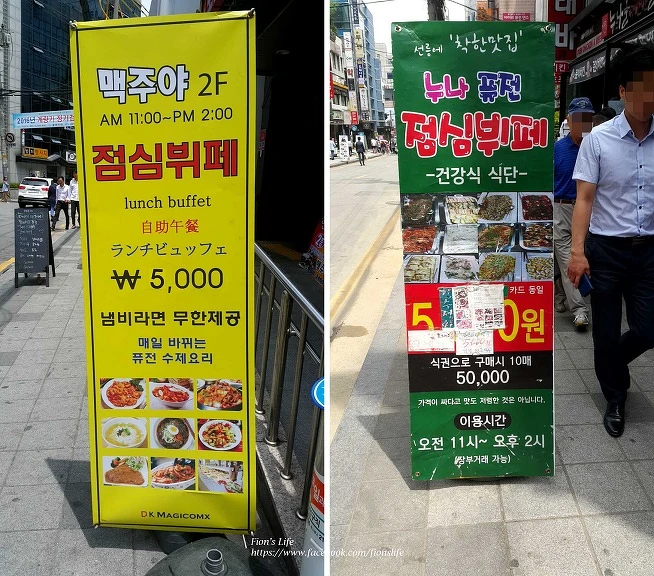 提供午餐buffet的店家,會在路上、門口擺個大看板,或是請阿珠嬤在門口舉牌或發傳單,提醒過路人「這裡有吃到飽自助餐!」。光是在宣陵站的5號出口一帶,就有4~5間提供午餐buffet的店家。