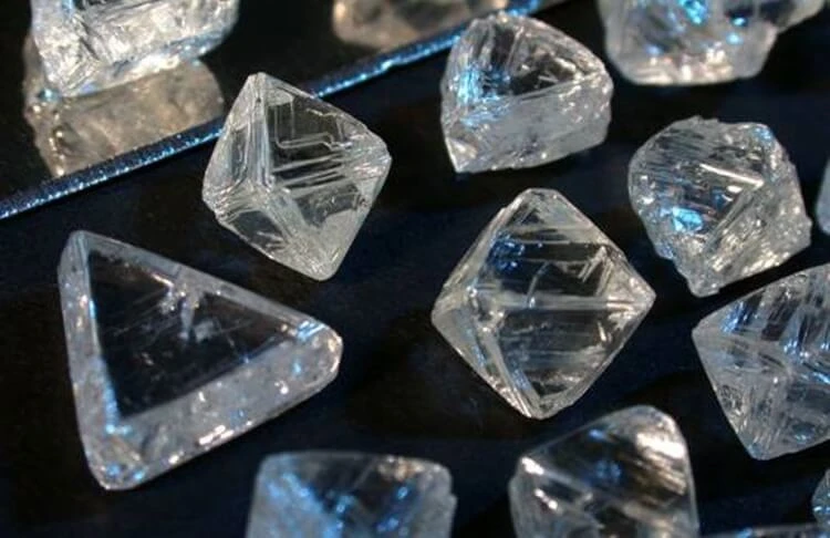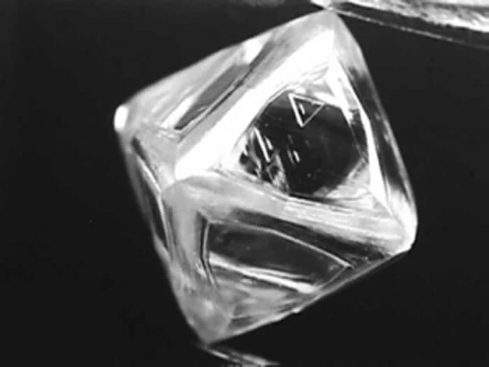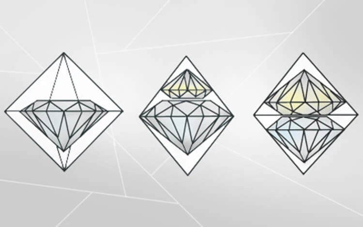 鑽石的原生型態基本上是像圖中的八面晶體,有時會有其他型態的,也許是在生長時因環境壓力的變更導致鑽石的生長轉向,不過大部分的都還是像兩個金字塔疊起來的小方塊這樣,特別可愛,上面還會有正三角形的生長紋。順帶一提,八面晶體對切割鑽石來說是最有利的,如下圖所示,切割起來簡易有效率。