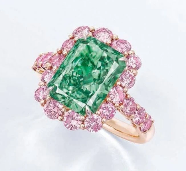 圖中間的綠鑽很值得一提,綠色的鑽石其形成原因是因受到自然輻射而改變晶格結構。在其形成期間鑽石接觸到地球上的自然輻射或與放射性材料如鈾礦放射性物質而產生綠色。色彩濃度飽和度高的綠鑽價錢可是驚人的高,例如最近在Christie's 香港拍賣會上,一顆5.03克拉的fancy vivid green 綠鑽 則展現破拍賣紀錄的驚人之姿以美金1682萬元落槌成交。