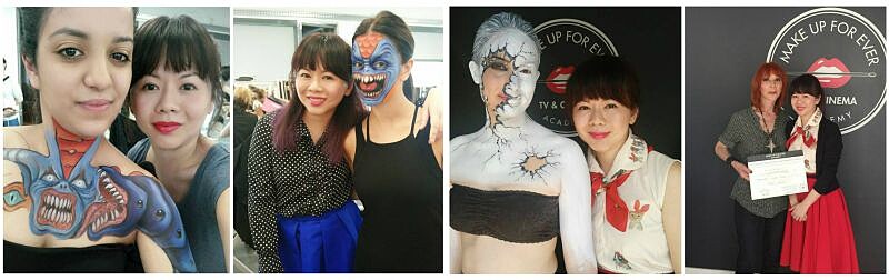但這五天密集的課程裡,讓我對這從來沒接觸過的領域多了些了解,從自己翻膜做出假傷口再上色,到老妝的學習,到身體彩繪,雖然老師的風格是本人不愛的妖怪系列,但技巧非常細膩,讓平常就喜愛畫畫的我,發現完全可以融合彩妝和繪畫的所有技巧在身體彩繪裡自由馳騁,最後反而有點欲罷不能耶!