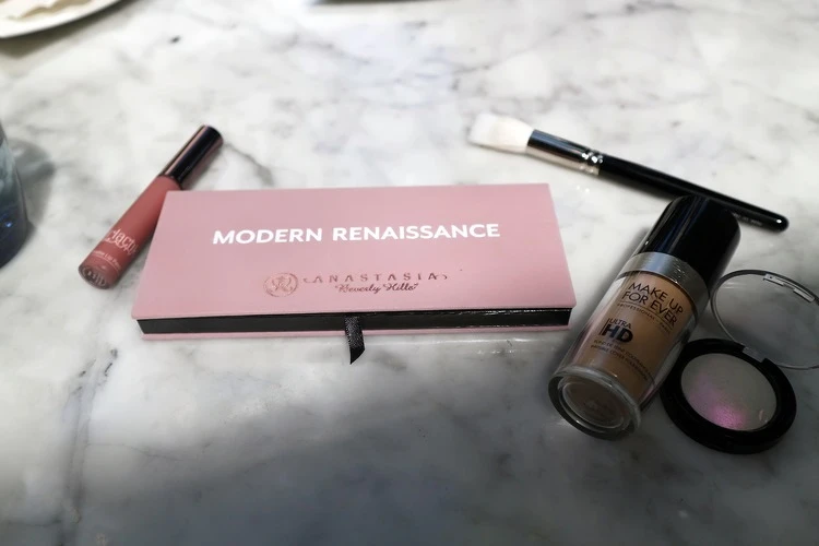 這次的妝容除了使用Skin Fetish 003,眼妝則是用了最近討論度極高的Anastasia Beverly Hill-Modern Renaissance眼影盤,整體顏色偏紅棕調。看似有點難以駕馭,但是每個顏色都顯色度極佳且充滿個性,是一盤配色非常有趣且時髦的眼影組合。底妝是MAKE UP FOREVER的Ultra HD無瑕粉底液,光澤與持久度都非常好,遮瑕度高、妝感卻又非常輕盈。唇彩則是用我最喜歡的液狀口紅品牌-Girlactik Beauty的Matte Lip Paint,雖然名稱是霧狀唇彩,但是一點也不乾,顏色也非常漂亮實用。