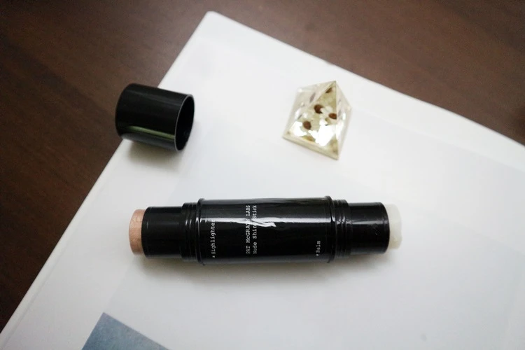 而這次與大家分享的色號是Nude,包含了三樣商品:一個粉狀打亮Iridescent Pink 003、一個雙頭的打亮膏Nude Shiny Stick highlighter+balm duo,與一個打亮的刷子。粉狀的打亮Iridescent Pink 003擁有非常特別的duochrome雙色折射效果。有點像小時候買的雷射貼紙,依照不同的光線角度照射會如同彩虹一般閃耀不同的光采,帶點粉紅與珍珠的貝殼感覺,完妝之後直接上在顴骨上就能有低調卻又細緻的光澤。