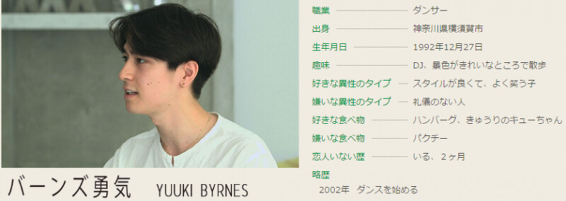 當然,本篇的重點還是節目裡的天菜,雖然來參加的男女們顏值都不錯,其中還不乏model,但在還在播映中的第一季的36集中出現了一位超級天菜勇氣拜恩斯(Yuuki Byrnes)(名字叫勇氣,是不是好有個性啊〜)