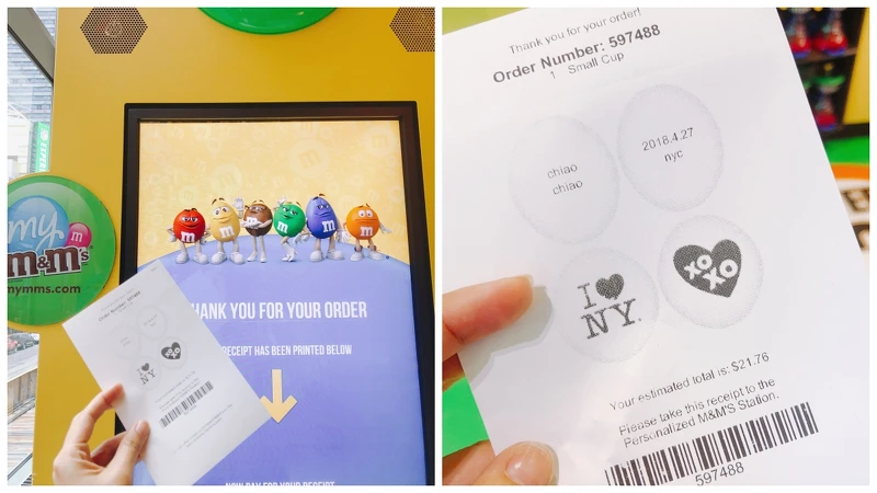 先結完帳後,就可到一旁的自動機選擇自己想印在每一顆M&M巧克力上的圖案與文字。機器本身已內建一些圖案可選擇,例如自由女神像、笑臉等符號,另戊還有能紀念生日、畢業、結婚紀念日的字句,也可以自行輸入想顯示的文字(不過只限英文與數字),一次能選擇4款圖文。像我這次就選了「I ❤️NY」、「XOXO」、「英文名字」、「2018.4.27 nyc」,選好後機器會列印出一張感應紙。