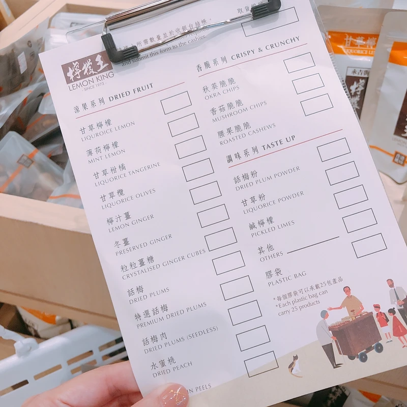參考價目:甘草檸檬一包港幣50、薄荷檸檬一包港幣50、陳皮一包港幣50、甘草柑橘一包港幣50、甘草欖一包港幣30、水蜜桃一包港幣25、話梅肉一包港幣30、話梅一包港幣25、特選話梅一罐港幣100、檸汁薑一包港幣30、冬薑一包港幣40、粒粒糖薑一包港幣25、秋葵脆脆一罐港幣45、香菇脆脆一罐港幣45、腰果脆脆一罐港幣50、話梅粉一罐港幣30、鹹檸檬一罐港幣40、甘草粉一罐港幣20。