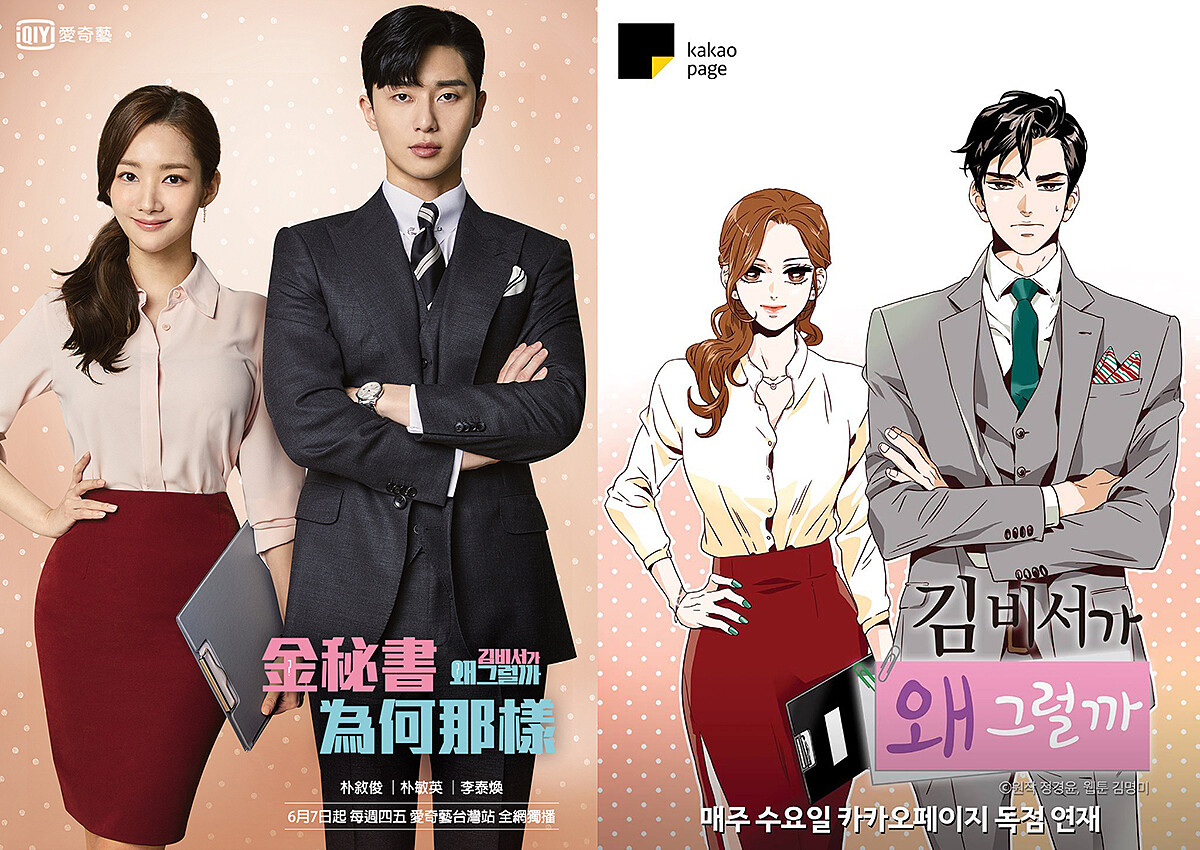 由於這部戲是網路漫畫改編,勢必要有一些漫畫般誇張的劇情。但跟日劇的漫畫改編比起來,韓劇比較容易入戲的原因我認為是會比較「收斂」。日劇可能很重視原汁原味、一到關鍵時刻一定要連滾帶爬的飛出去(像紅極一時的「野田妹」),當然沒有不好,就看大家的接受程度。《金祕書為何那樣》把誇張的部份都用表情來解決,朴敏英的演技達成了很好的功效,雖然她一身正裝時不時都在聽命行事,但表情帶動了觀眾很好投入搞笑的層面,這一點也讓人加分。