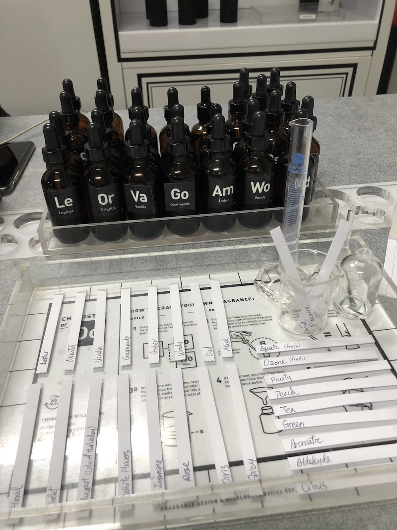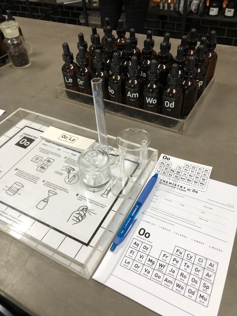 每一組調香原料共有27種氣味。一開始必須將所有的氣味都聞過一遍,將香氛油滴在試香紙上,並將感受及喜好記錄下來。