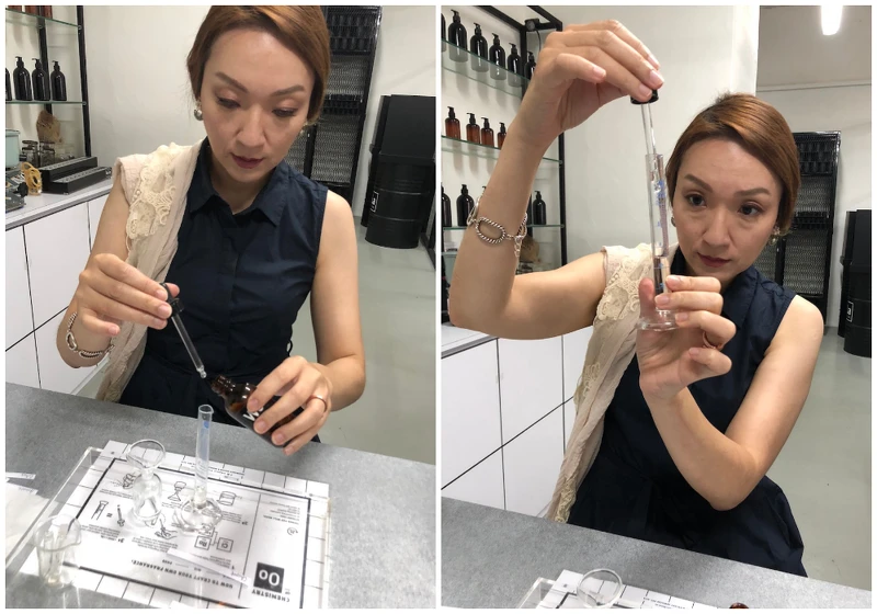 接著挑選出自己最鍾意的前調、中調及基調香氣,先在一個試作用的小玻璃管裡,將所選的香氣一滴一滴地,按照自己心裡想像的畫面堆疊起來。在此同時,一定要記得將每一種香氣所使用的滴數記錄在表格裡.等到調出心目中最喜愛的那個味道時,香水的雛形就浮現了。