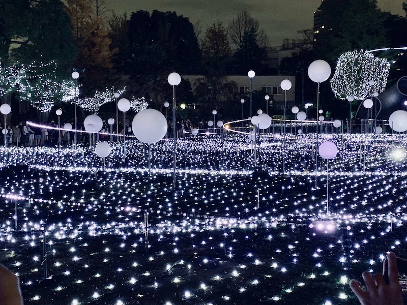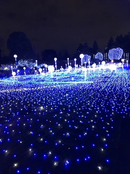 以「宇宙」為主題,用51萬顆LED燈的藍燈與100顆發光氣球,芝生廣場舉行的「Starlight Garden」,展現外太空與七大行星的美,加上燈光音響秀,簡直是帥呆了!我們很幸運的看了12分鐘長的「七彩泡泡點燈活動」(12/16截止)
