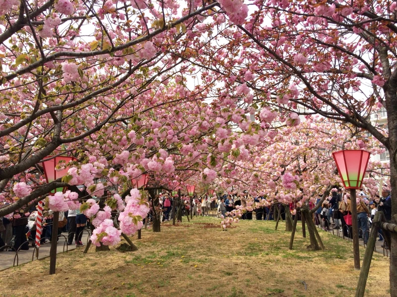 130個品種每年百花爭艷,會場真的就像櫻花隧道一樣壯觀。而官方每年都會選出一個今年的代表櫻花,今年是紅手毬,有點像紅色繡球花。