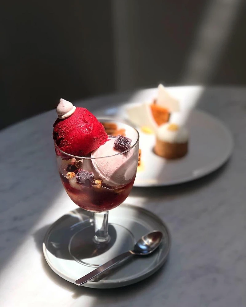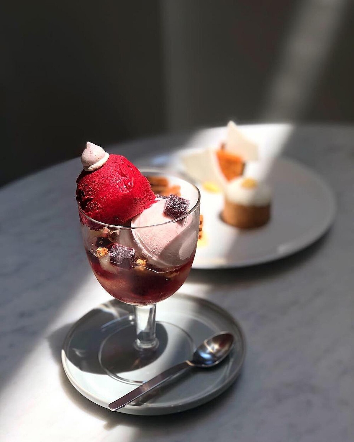 「季節限定法式聖代」一匙一匙的挖,總是又吃到驚喜,豐富的層次讓人融化。黑醋栗雪酪sorbet、野草莓優格gelato、撒著黑醋栗軟糖、西洋梨果凍、檸檬寒天凍、三種莓果果醬…聽著主廚星星一一細數著,沒有俗麗艷彩,每一道手工程序,讓色澤與味道自然宜人,口齒芳香。