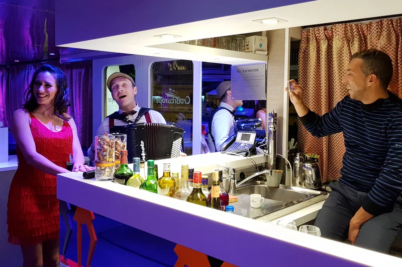 隔天,晚上在船上還特別邀請了法國的兩人歌舞秀,在 60分鐘內又唱、又聊、又舞,帶來很傳統的歌舞互動娛樂。老實說,能如此近距離的欣賞,而且就為了船上的我們幾個人表演,還真是有種在家裡開私人 Party的尊寵和浪漫的享受啊!就這樣, 4天3 夜的河輪漫遊在塞納河上,從河中央反觀巴黎的河畔景緻,不同的視野,帶來不一樣的明媚風光;而手握一杯美酒,輕鬆恣意地在亞歷山大三世橋、艾菲爾鐵塔和聖母院中穿梭,偶爾,還下船一覽羅浮宮和奧塞美術館領略無價藝術的華麗洗禮。這換個方式的巴黎之旅,在意外和不意外之間,巴黎的璀璨和甜蜜時光,收藏在嘴角微笑的無盡暖暖回憶裡。