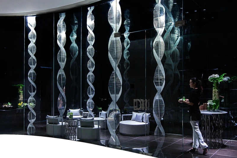 首先,它跳脫一往泰國 Spa 給人的柔美舒適,又或是香草庭園的南國島嶼制式風情,改以黑色、銀色、透明和高科技前衛組合的另類未來感視覺風格,在大膽和極簡中融合適度的 Spa軟柔元素;接著,待我進入芳療區,全黑的走道空間,天空上掛滿成千大小不一的水晶燈,宛如美麗的水珠般,一會兒碇藍,一會兒水綠;地上則閃爍著散落燭光,整個人又如穿越時空來到了一個璀璨夢幻的不真實時空中,讓人張大口嘖嘖稱奇外,很難想像自己不過是在曼谷百貨公司的 Spa館中。