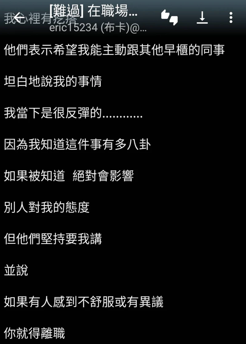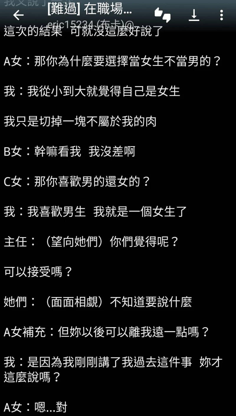 儘管原PO心裡感到不舒服,她還是屈服照做了。之後,主任要求她也要一併告知晚班的同事(儘管原PO工作現場不會遇到他們),才能確保所有人都知道、都能接受,「如果有新進的同事,也要主動跟他們說」。對於原PO的過去,同事們反應不一,日班同事覺得「沒差吧」,但晚班同事有一些反應比較不友善,有人問「你喜歡男的還女的?」「你以後可以離我遠一點嗎?」「我沒辦法把你當完全的女生。」主任更當著大家的面開玩笑:「你們想看原PO扮女裝的樣子嗎?」主管們認為,自己是被欺騙的一方,如果原PO想留下就必須讓所有人知道自己的過去,不想講就走人。