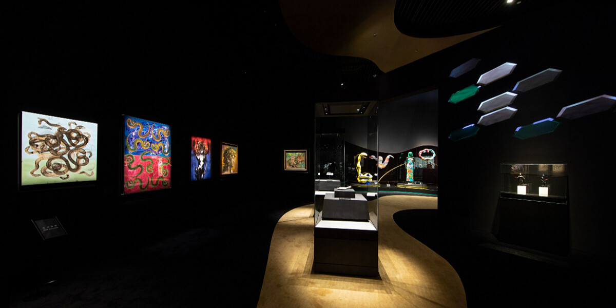 展區的第二部分集結了現代與當代藝術創作中的蛇形意象,從這些創作媒材與風格迥異的作品裡,可窺見人類對於蛇的迷戀與仰望,當然,蛇所象徵的權力、慾望、危險與神秘,同樣讓人懼怕,透過作品抒發並呈現創作者內心對於愛情、親情等各種關係的感受,對應蛇在人類文明中扮演的角色,是很有趣的呼應。這個展區的作品有些繽紛可愛、有些浪漫詩意、有些華麗眩目、有些則滿載異國情調,非常值得慢慢欣賞。