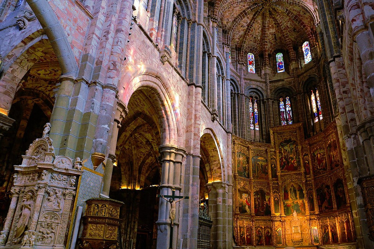 阿維拉古城牆為長方形的造形,除了依山丘地勢而建有些高低起伏以及點綴了中世紀古城牆的基本款防禦塔樓外,它最特別的地方則是在一方城牆上還鑲嵌了一座教堂。而這名為「阿維拉大教堂( Ávila cathedral)」的教堂來頭還不小哦!因為它是西班牙的第一座哥德式建築教堂,也是少見同時具有宗教和防禦工事雙重主要功能的中世紀建築物。此外,它融合羅馬式及哥德式風格,再加上教堂內細緻的文藝復興風格雕刻藝術,雖然不走華麗和浮誇的路線,卻名列西班牙三大最美麗的教堂之一。