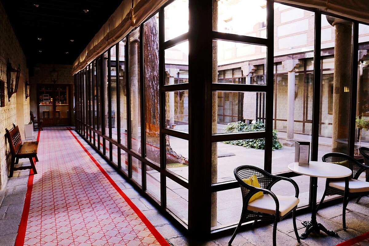 至於我這回的西班牙阿維拉 Ávila古城之旅,除了很享受那千年的歷史味和藝術的美學氛圍外,另一個也讓我很是喜愛的,則是這回入住的這間「Parador」西班牙國營飯店了!它不但地理位置很好,就在城門口,而且很有歷史味,但是沒有一般歐洲城堡或是老宅的恐怖感,倒是有種老宅精品旅館的高雅質感,很舒適。此外,他們還有個透天中庭園,廊道上還掛上傳統古董畫作,放了幾張小桌,在這喝杯咖啡休憩一下,單是看著光影穿梭庭園空間,就是一個好令人享受的視覺、嗅覺和味覺的三「美」時光。