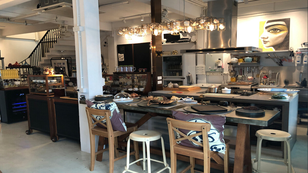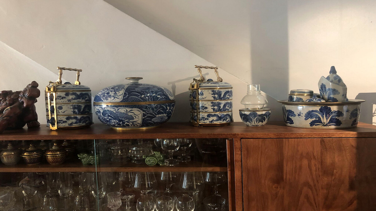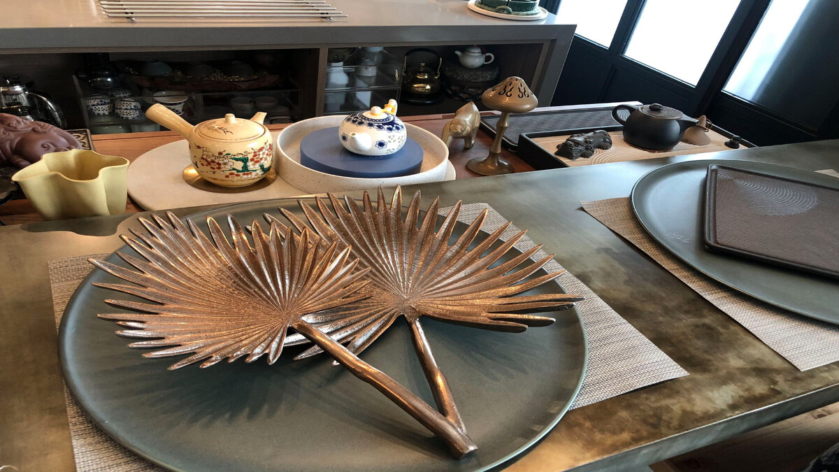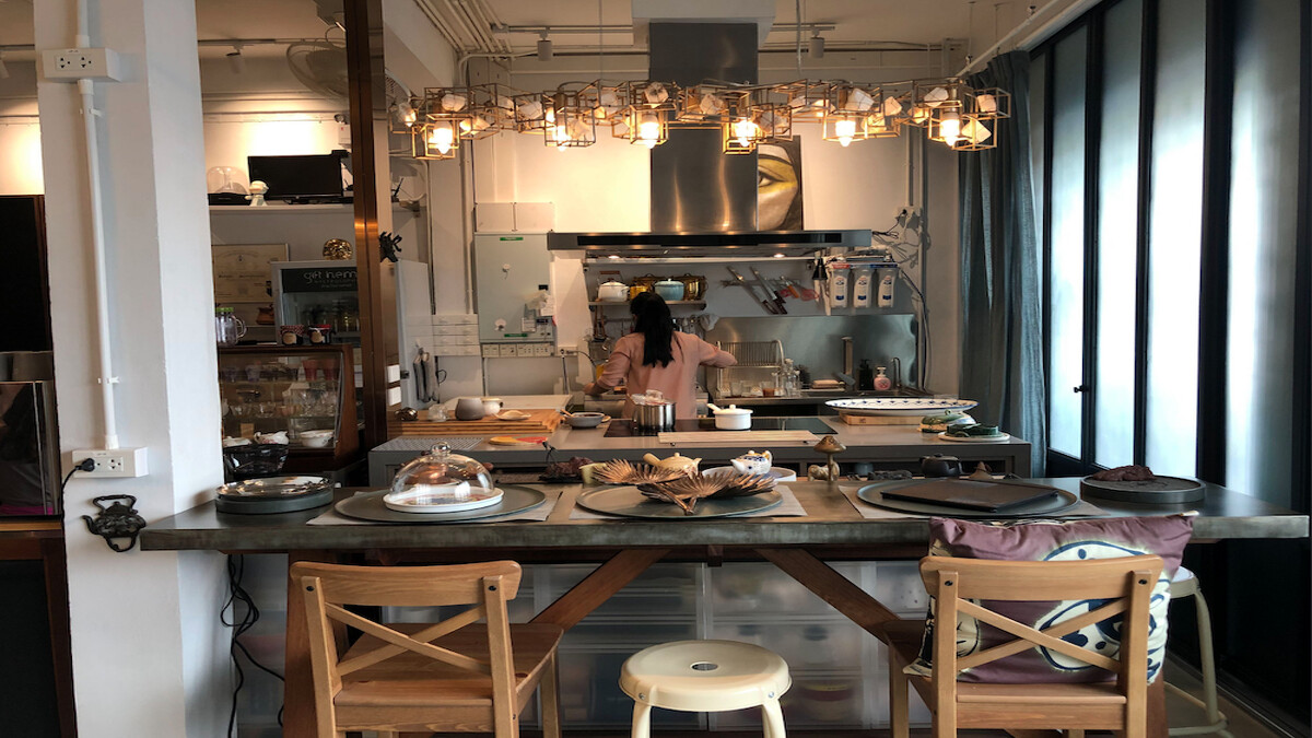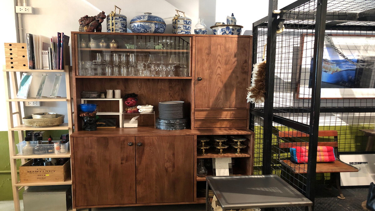 趁著備餐的空檔,我起身參觀這個空間。一樓的開放式格局裡,除了用餐區的大桌子之外,還有準備飲料的小廚房,專門準備飲料與甜點之類的小食。旁邊的復古風格櫥櫃裡擺放著各種古典的茶杯與茶器,陶瓷的、金屬的、漆器的,與各式玻璃瓶罐整齊的併排在一塊兒,擁擠卻又乾淨有條理。