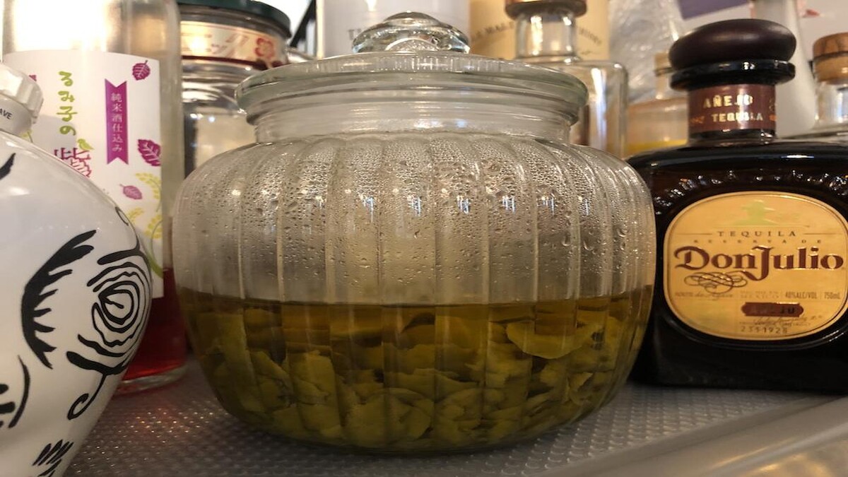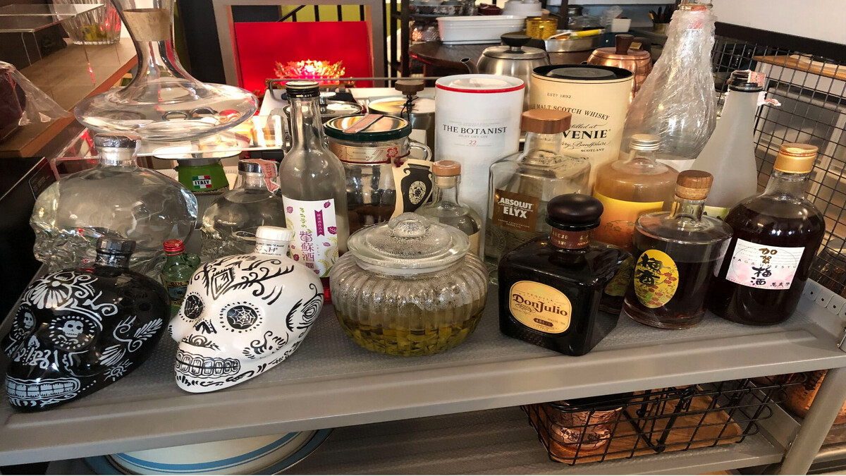 在發現女主人是個茶文化熱愛者之後,轉頭又瞥見一個金屬製的中島,上面擺的都是各種酒。原來女主人也是嗜酒專家呢!龍舌蘭、威士忌、橘酒、梅子酒、伏特加,該有的都有。此時我的眼睛捕捉到藏在前排正中間的一個玻璃罐,裡面泡著綠綠的東西。我問她這是什麼,她說:「這是我自己泡的青檸葉泡酒。」我厚著臉皮問她是否可以讓我問問看(芳療師的老毛病),女主人說當然好!