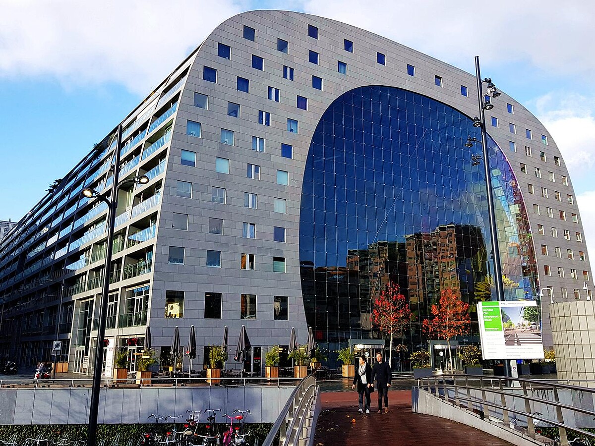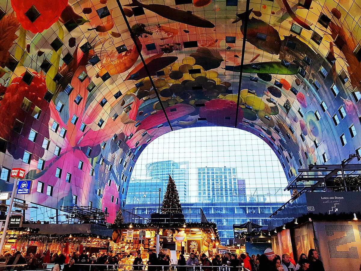 至於車站廣場的另一邊,則是目前被票選為全世界最美麗的複合式市場「Markthal」。這座有如一個巨型立體ㄇ字形的建築物,開幕於2014年10月,原本只是因為歐盟衛生環境法規的新規定:「所有熟食都必須在有頂蓋的空間內販售」而衍生的大型室內市集建案,卻沒有想到這個複合了228 戶公寓和近130 個攤位、商店、餐廳等的巨型空間,善用混凝土原件由工廠預先完成後再運送到工地現場以堆疊成型的工法,搭上玻璃帷幕巧思(前後封為密閉空間,並保有透光的節能功效),並且由荷蘭藝術家阿諾庫內 (Arno Coenen )領軍,將室內放眼所及的天花板和牆面,幾乎高達11,000 平方公尺的面積,以市場的「蔬果」為主題,繪製出目前世界上最大面積的彩繪作品。整個建案完工後,無論是創造了新的住商共構環境、翻轉傳統市場風貌,又或是建築工法和美學等,一下子成為多方討論的話題。現在他們不但成為時尚市場的代表,單就是每天慕名而來的觀光客帶來的經濟效益就大的驚人!可謂是近年來最成功的市場華麗變身的典範。