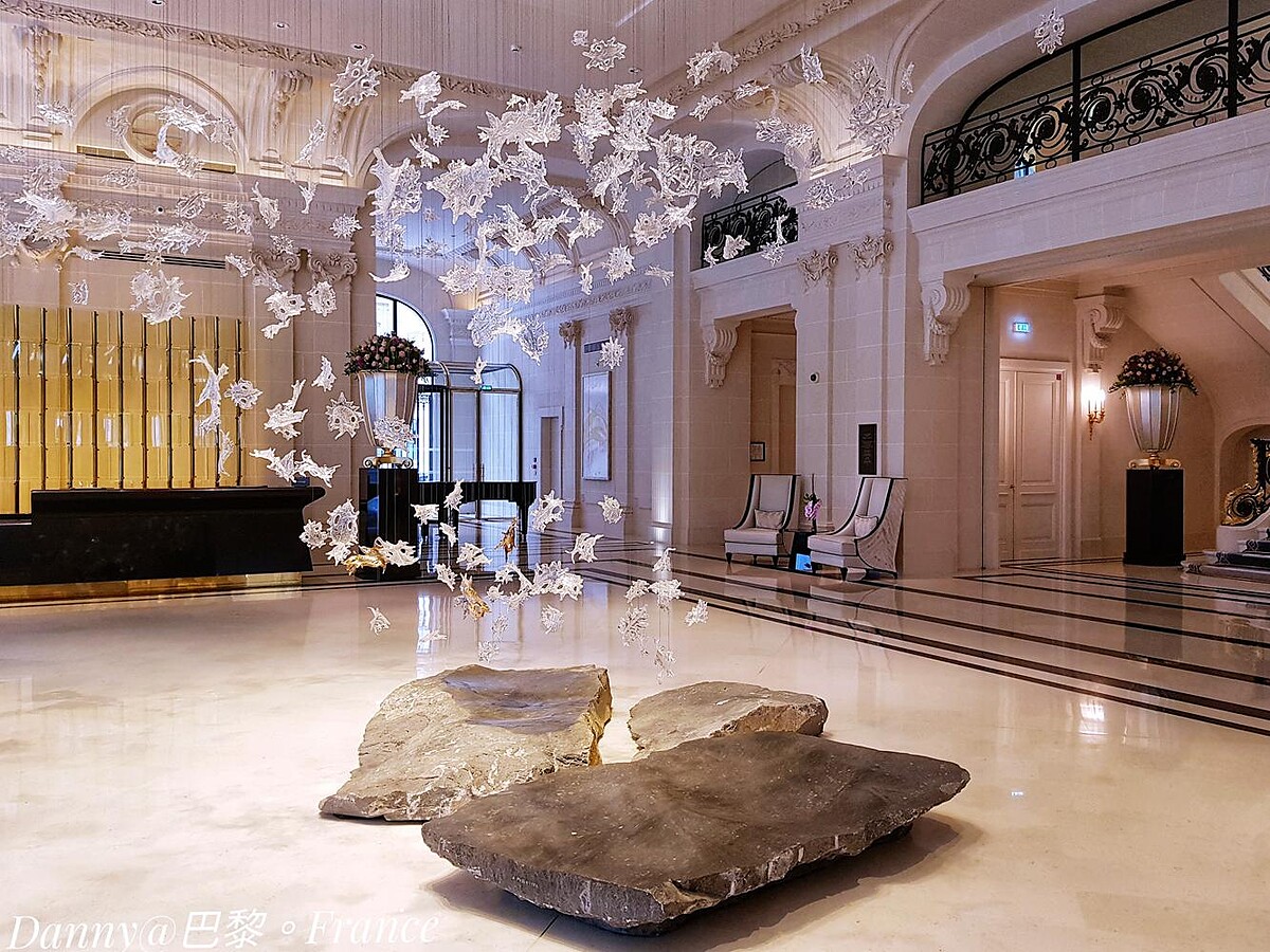 算起來,巴黎半島酒店有兩個大門。不過,真正Check in 的入住櫃檯,則在主街旁的的 Avenue des Portugais 上。因為這裡是側巷,可以方便房客搭車在此上下,又或是車輛直達並駛入地下停車場內。而從這邊的大門進入酒店,象牙白為基底的色調,搭配適量的大地黑色,以質感為主的簡約式現代巴黎味,巧妙的凸顯了另一個法式的時尚風格,你也會同意,半島酒店把巴黎獨特又多面的美學,流瀉在大廳中。當然,如果你和我一樣,在大廳的一角靜靜地欣賞著大廳中央懸掛的 800塊 捷克知名頂級 Lasvit 手工製葉片形水晶吊燈藝術,那宛若法國梧桐葉從天空翩翩飄落的意境,光線在水晶葉片上若隱若現的穿透,再帶著你的視線緩緩落在三塊大石上,那精緻和粗曠的相遇,你也會和我一樣同意,這就是巴黎最浪漫的禪味啊!