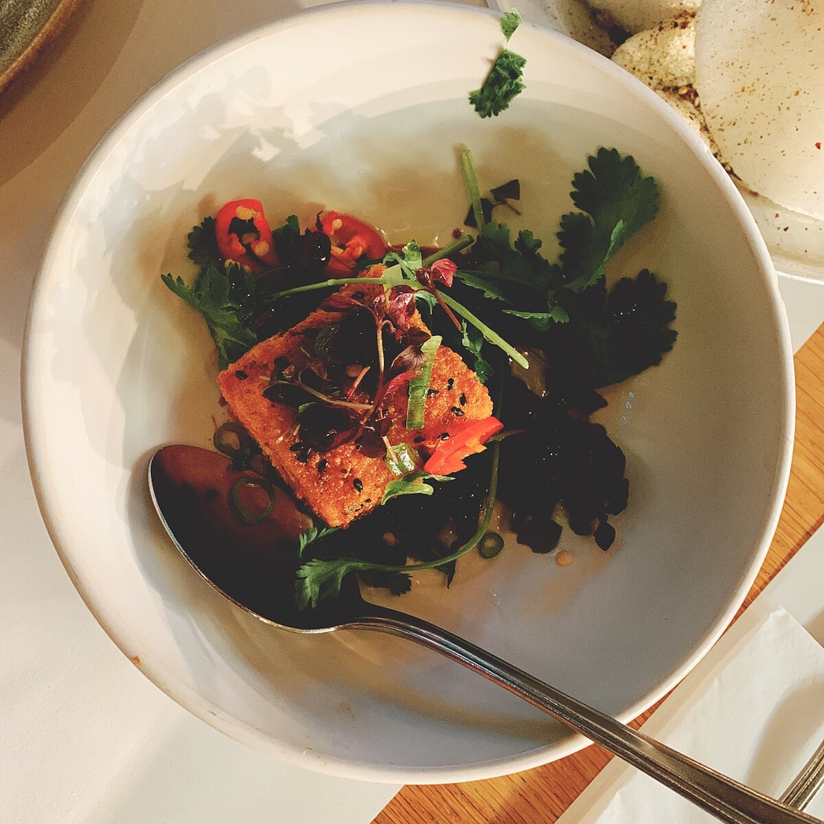 這道Chilli Tofu是我每次來必點,很少在英國非亞洲菜專門的店家找到能好好料理豆腐的廚師,所以令人份外驚艷。他們每家分店的菜單多少會有些許不同,也會有部分隨著季節更換,我曾經吃過一道跟空心菜一起料理的嫩豆腐也是令人懷念!