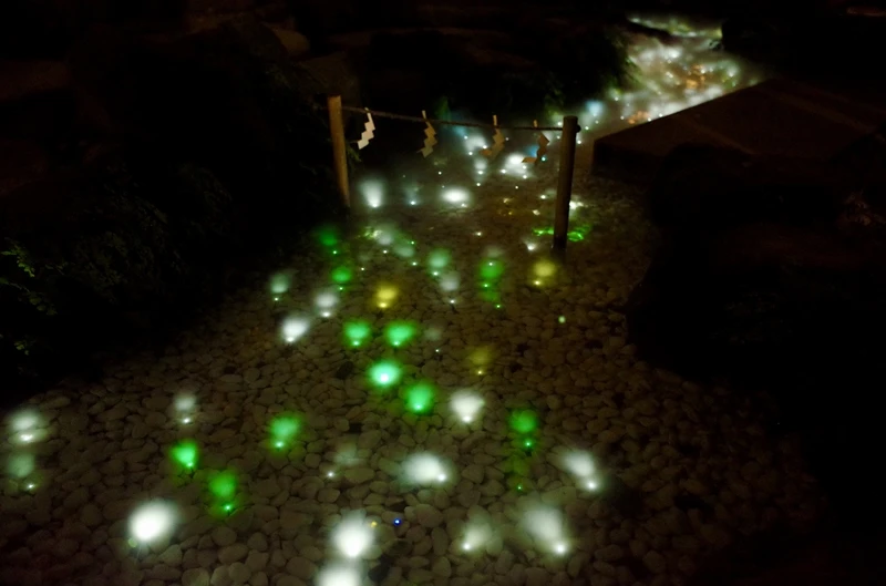 晚上的風鈴迴廊打燈後又是另一種意境,並且神社境內的小川也會放上燈飾塑造銀河的感覺。