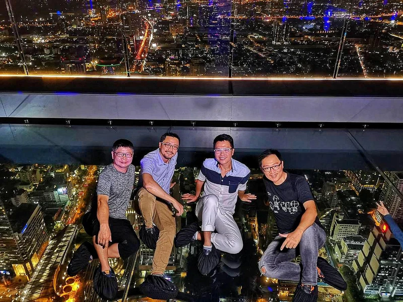 此外,74樓至78樓設有不同視野的觀景設施,而頂樓不但是露天360度的觀景台,可以將曼谷的水晶美麗夜景盡收眼底。更重要的是,這裡還設有一處用強化玻璃打造的「玻璃棧道(Glass Tray)」,套上鞋套站在超級清晰的透明玻璃上,單是走上去,就需要很大的勇氣。而站在上面往下看,猶如整個人飄在300公尺的高空上,腳底板超癢,甚至全身起雞皮疙瘩,心中狂喊:「泰刺激了!這曼谷第一高樓的空中漫步體驗,實在是泰讓人驚奇了!」