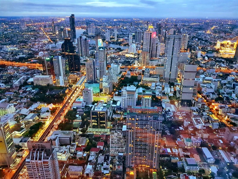 而來到曼谷,璀璨的美麗夜景近年來深受遊客喜愛,因此,一間間時尚的天台餐廳便成為曼谷搶手的熱門景點之一。然而說到目前曼谷話題最夯的賞夜景勝地,當屬目前是東南亞第一高大樓,高314公尺的「王權大京都大厦( King Power Mahanakhon)」大樓頂樓了!這棟兩年前才完工的摩天大樓,造型本身就是一絕,不走傳統建築路數,而是以猶如啃食過的後現代主義和結構主義美學為主,而且風格之強勁,一開幕,就搶下了曼谷新地標的寶座。