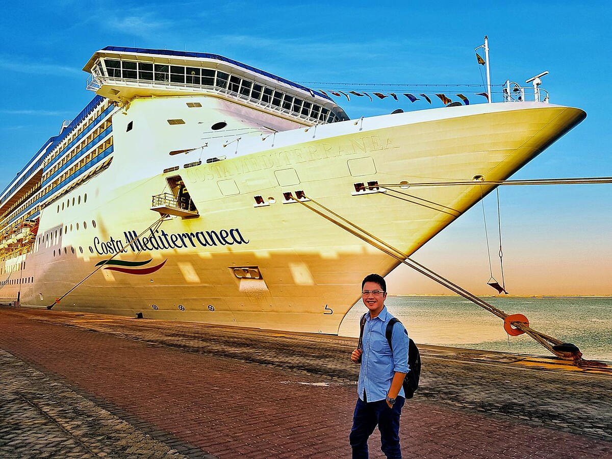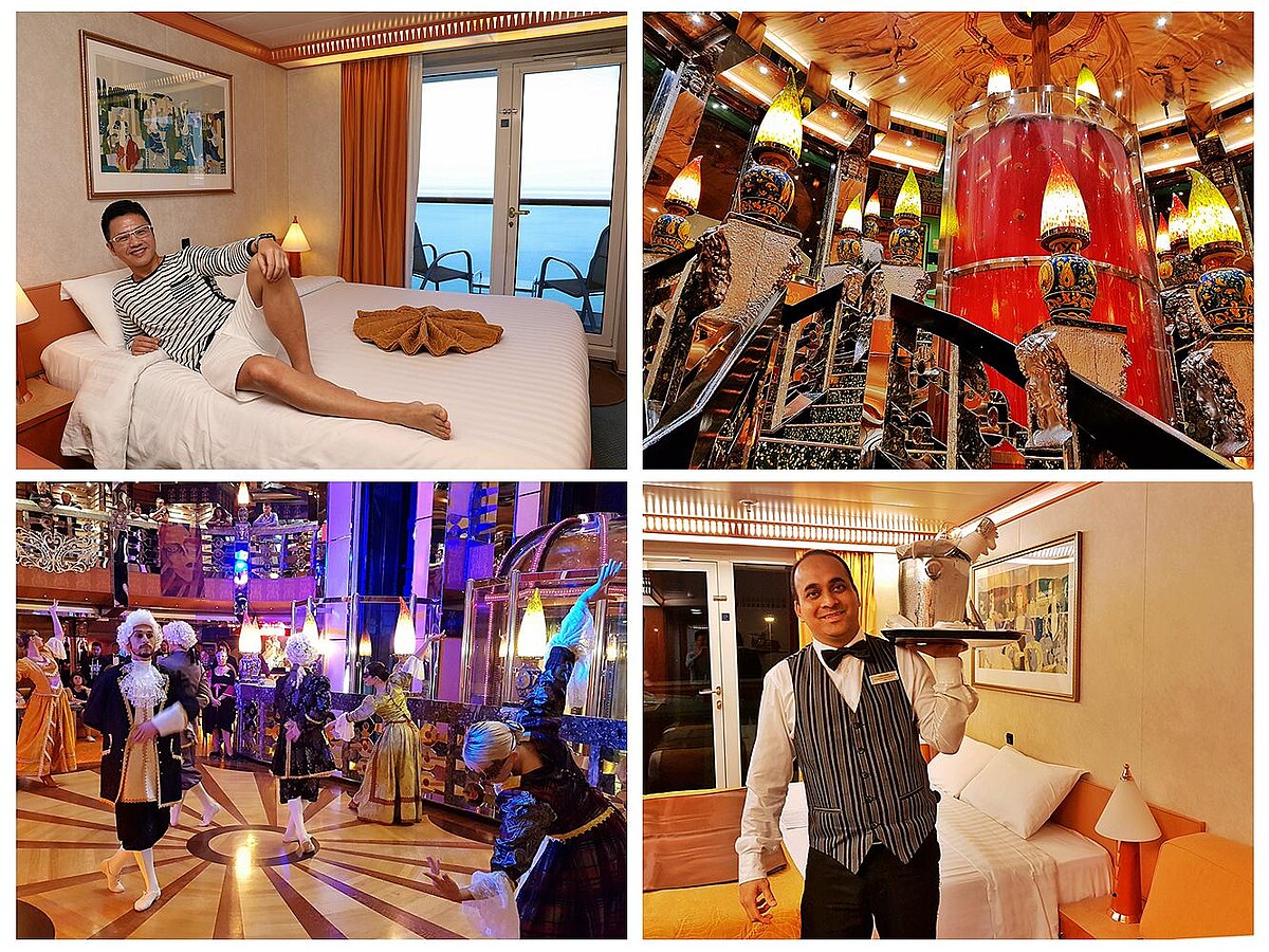 我這回搭乘的是歌詩達郵輪地中海號(Costa Mediterranea),8天7夜航巡在波斯灣和阿曼灣之間的穆斯林世界。這艘船總噸位 85619噸,總房間數1057間和載客量為2680人,以目前的郵輪市場來說只能算是中上型郵輪。還好每年的11月到隔年的3月間,波斯灣和阿曼灣的海象穩定,加上氣候佳,白天平均溫度約22~25度,晚上則下降到17~15度間,非常的舒適,搭這樣大小的郵輪算是剛剛好。這艘船的裝潢設計非常的地中海風情,讓人彷彿置身17、18世紀義大利宮殿外,處處還可見威尼斯繪畫風格和藝術收藏品。此外,巧妙地融合了慕拉諾島手工玻璃及南義陶鄉格羅塔列工藝品等美學元素,再加上每晚舉辦面具嘉年華、義大利主題之夜等,完全有置身義大利的錯覺感!