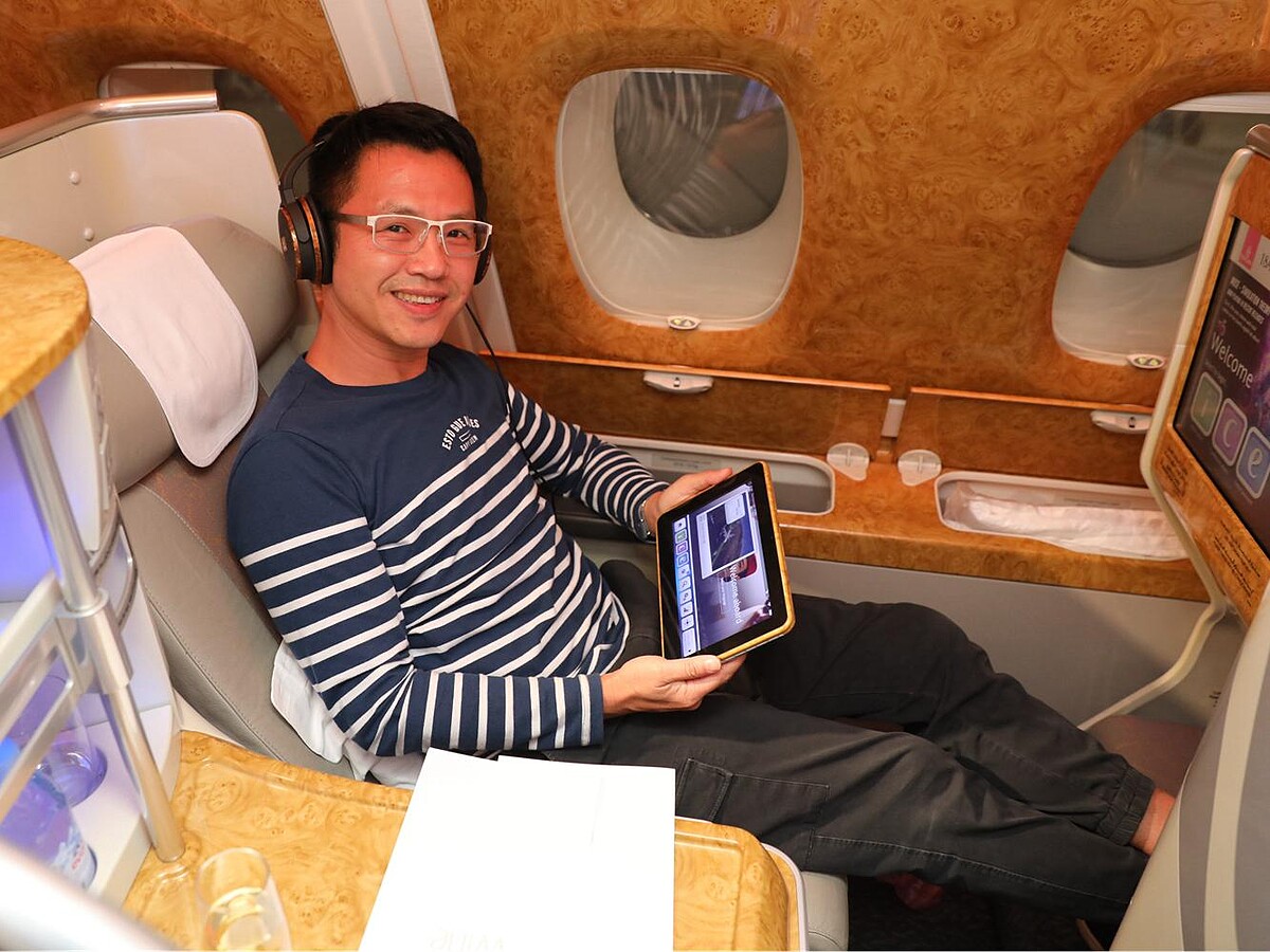 阿拉伯世界的郵輪在好幾個港口都可以上船出發,不過台北目前天天有直飛杜拜的航班,因此在杜拜碼頭上船是最佳選擇。特別是 Emirates 阿聯酋航空以A380型的超大型飛機直飛杜拜為主,不但座位特別寬敞,螢幕也比其他機型的飛機大很多,而且就連經濟艙都有「過夜包」提供。這點,讓乘客從一上飛機開始,就有「有錢就是大氣」的阿拉伯油國奢華感。