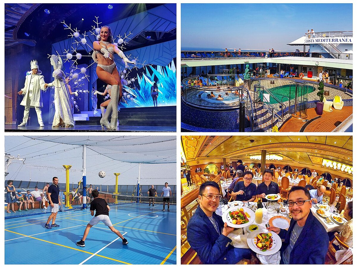 由於歌詩達郵輪是義大利國籍,他們的特色代表之一就是美味的義大利料理,而且無論是在地中海或是中東的阿拉伯海,餐點都在水準之上。此外,他們也以「熱情、活力」出名,郵輪設施主打年輕和家庭族群,廣設許多娛樂設施如青少年遊戲間、戶外籃球場、兒童看護中心、兒童專屬泳池、大型的健身中心、多處律動水池,以及一個超大型Spa養生中心等基本配備外 在歌詩達鑽石皇冠號上更是加增了4D電影院、雷射遊戲室、超級臨場感的F1賽車模擬遊戲室,還有3座大型游泳池。而且,兩艘船的泳池畔隨時有活力十足的工作人員帶領大家帶動唱玩樂,超級歡樂。