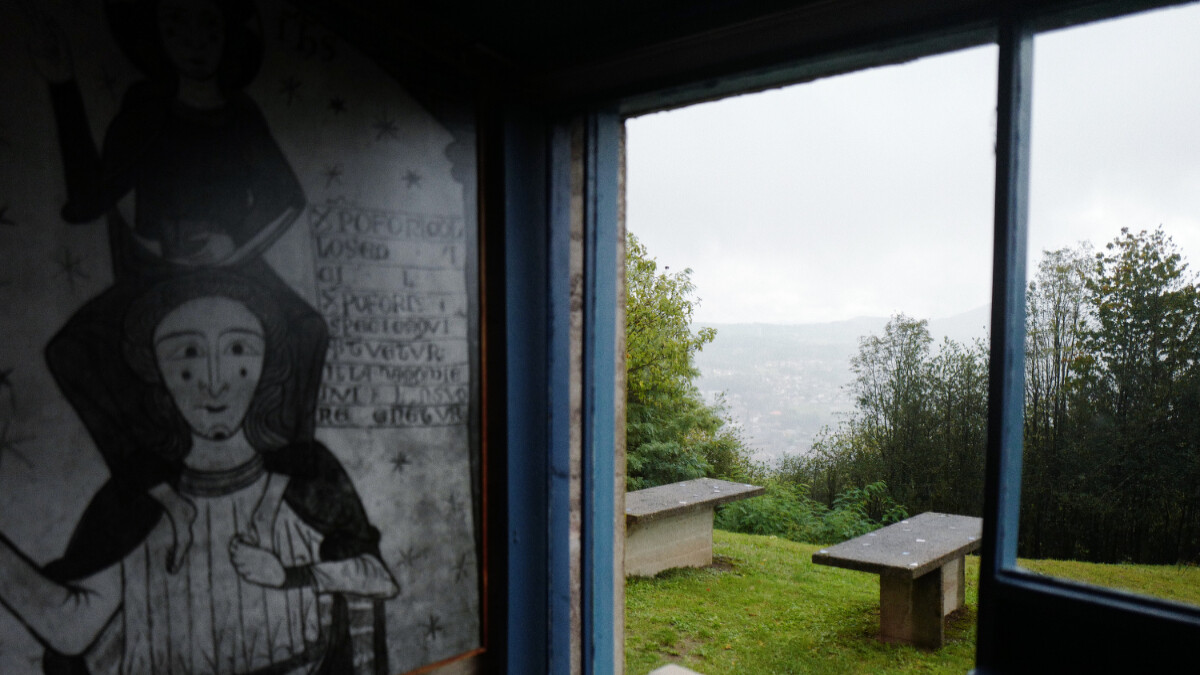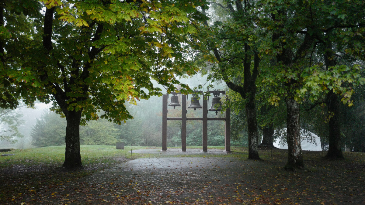 這個小鎮位於山腳下,天氣變化很大,再加上連著下了好幾天的雨,所以我沒遇到大雨已經很萬幸了。頂著小雨邊走邊牽著腳踏車走上坡,不是件容易的事,雖然不算太陡,但單徒步需要花30分鐘左右的時間(大約快兩公里的距離),更何況我推著車,大家應該可以想像到畫面吧!不過,先苦後甘不是沒有道理的,沿路被高聳的樹林包圍,加上冷空氣與濕氣,讓我散步在霧裡,有種被引領到人間仙境的感覺,當看到教堂本人時,先是邊站著發呆邊喘氣,等著呼吸恢復正常節奏時,接著是興奮,嘴角無法克制的上揚與瞳孔不斷處於放大狀態,最後已分不清是雨水還是淚水了。我明白這樣的反應有點誇張,但如果你跟我一樣的著迷建築,或者說喜歡美和藝術的人,只要親眼看著這美麗的建築、站在這被樹林簇擁的小丘頂上,都會有很多感動。