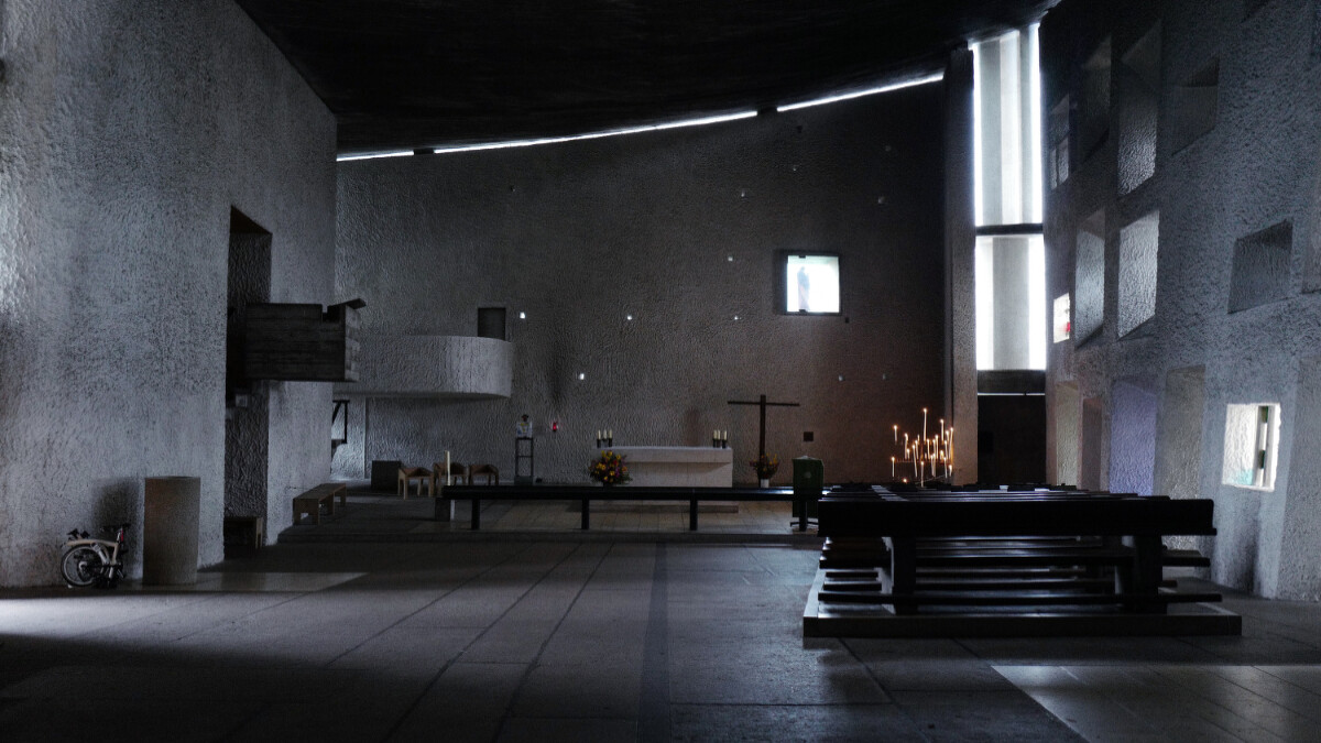 繞了一圈後走進教堂,平靜的心一待就待了快兩個小時,即使陰雨綿綿的天氣,卻沒有消磨掉我的情緒,加上光線穿透南面的每一扇光窗,每面玻璃上描繪自然和宇宙的圖案,有星星、太陽、鴿子、葉子、花朵和海洋,這代表人類迎向大自然。而東、西、北面的禮拜區,天窗因不同時間的陽光,會有不同的光線變化,尤其是朝東的紅⾊色牆面的塔樓,早晨在太陽的照耀下彷彿被烈焰環繞,就象徵重新從黑暗中回歸。雖然我不是信教徒,但柯比意稱它「無法用言語形容的空間」讓我感動、帶給我安定、舒服和喜悅。