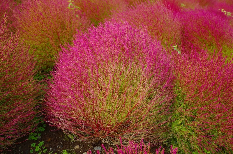 還記得4月MiKU介紹過位於茨城縣的國營常陸海濱公園的粉蝶花海嗎(點這裡可以複習)? 其實粉蝶花季一過公園就在同一片山丘改播掃帚草的種子,約有3萬2千棵,從7月中旬就可以欣賞一團團有如綠色毛球的掃帚草,進入10月氣溫轉涼後其顏色由翠綠轉緋紅,最盛期如同一片紅海般壯觀。