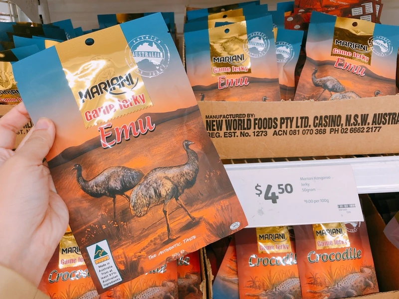 第一樣要介紹的零食就非常有澳洲風味,Emu就是鴯鶓,是一種長得很像鴕鳥的動物,目前僅生長於澳洲,所以又被稱作澳洲駝鳥,據說肉質吃起來像紅肉一樣。從架上就能發現澳洲超市滿容易看得到動物肉乾的,從袋鼠、鱷魚到Emu都有。