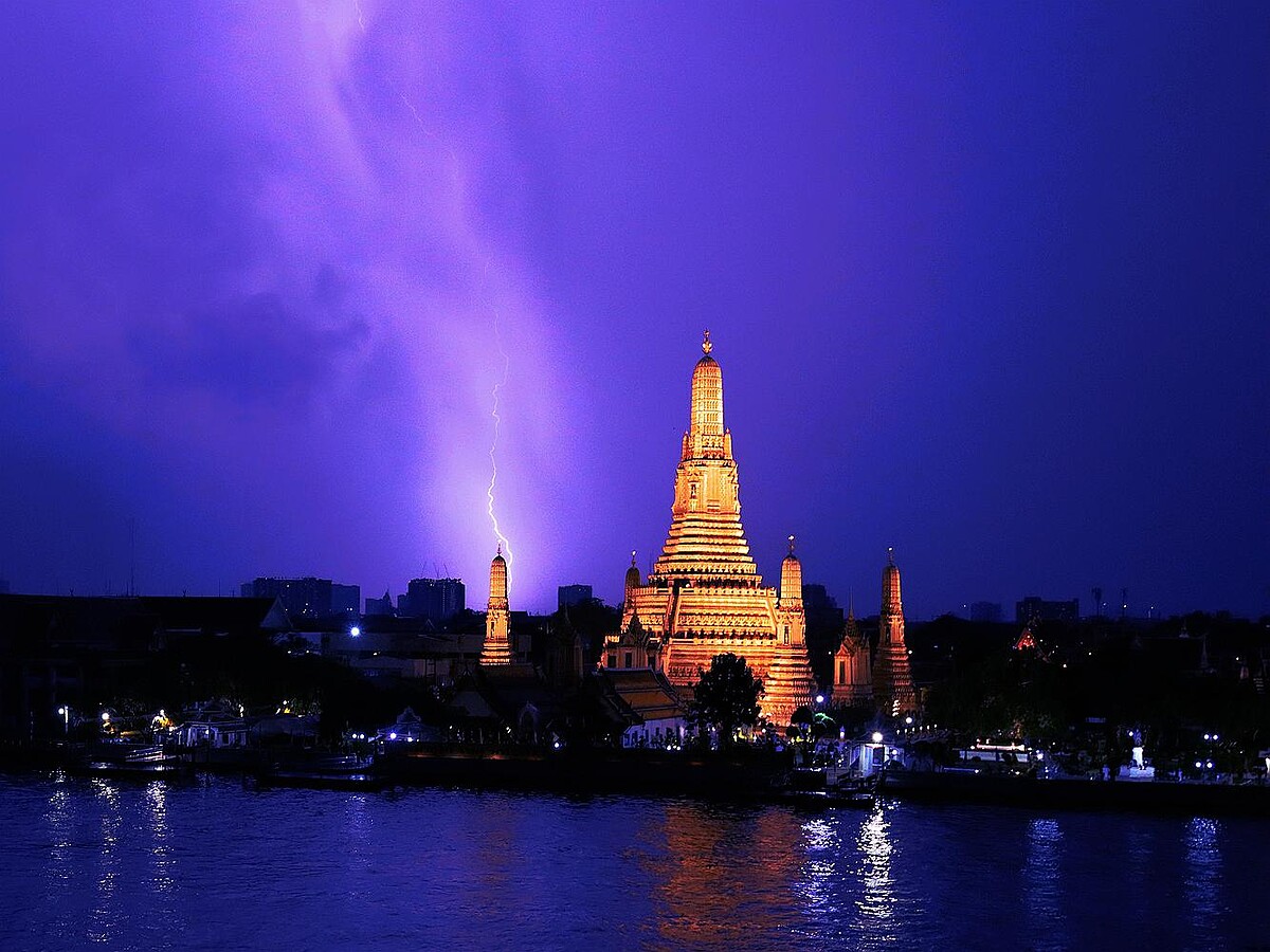 吃完晚餐後,原本我們準備回房換裝再搭船到河畔夜市去走走,卻沒想到才一進房,就聽見窗外一陣暴雨疾疾落下,轉身就打亂了我們原本的計畫。於是我和友人只好臨時讓計畫也轉個彎,就換到飯店天台上喝飲料,繼續和我們計畫中的河畔美景約會。只是有趣的是,這眼前的昭彼耶河恰恰一河為界,我們飯店這畔是天空雲層厚重且雨珠暴大,而對面的曼谷著名地標「鄭王廟(Wat Arun)」,卻是天空異象奇特,無風無雨,一路不間斷的各式閃電遮空,持續好久好久,讓人看得嘖嘖稱奇!而我們原本因為暴雨打亂計畫有些低落的心情,也來個180度大轉彎,被這難得一見的天空異象秀,驚喜得一邊狂按相機快門,一邊應著不時的雷聲吆喝著,好不開心啊!而當拍到閃電的那一刻,就像是要到糖果的小孩般,大聲驚呼著說「我拍到了,我這輩子第一次拍到閃電,實在太開心,太感謝老天爺。曼谷啊曼谷,你實在太酷,太不可思議了!」